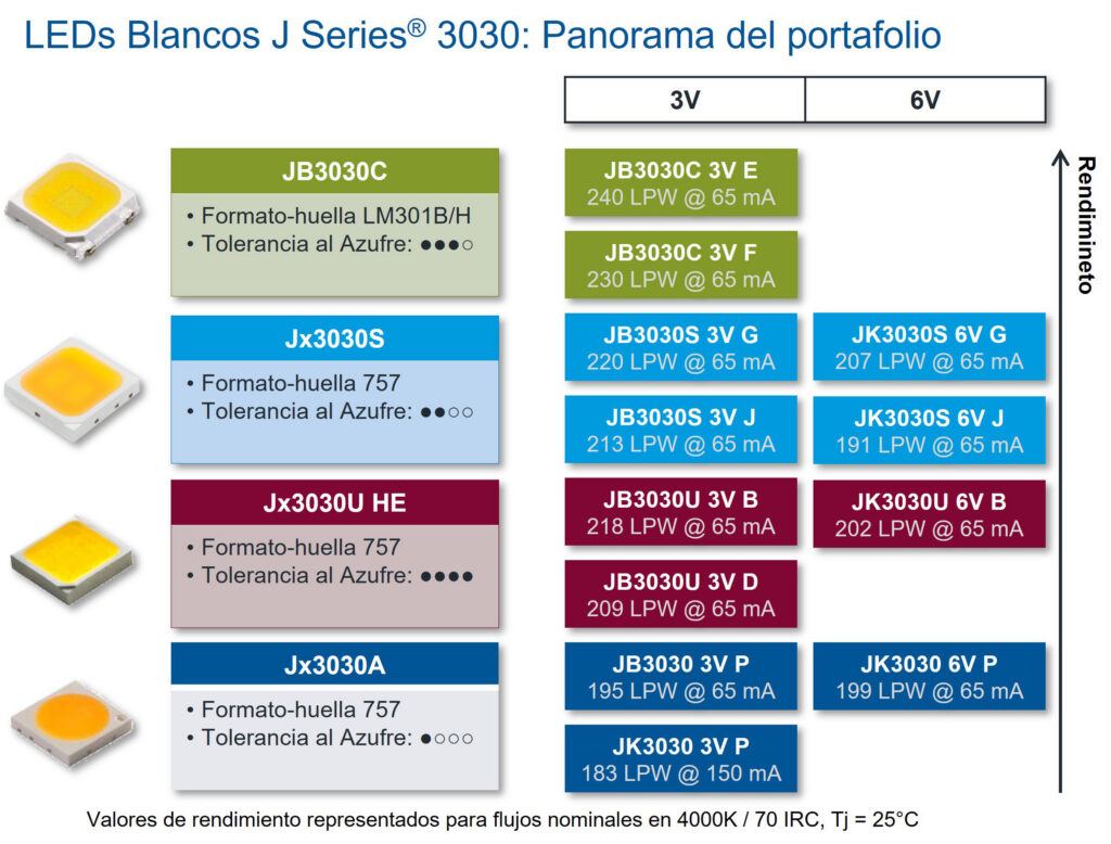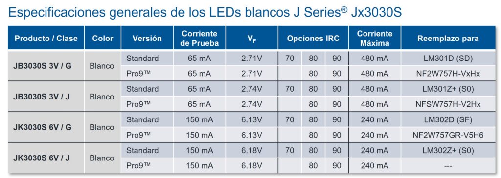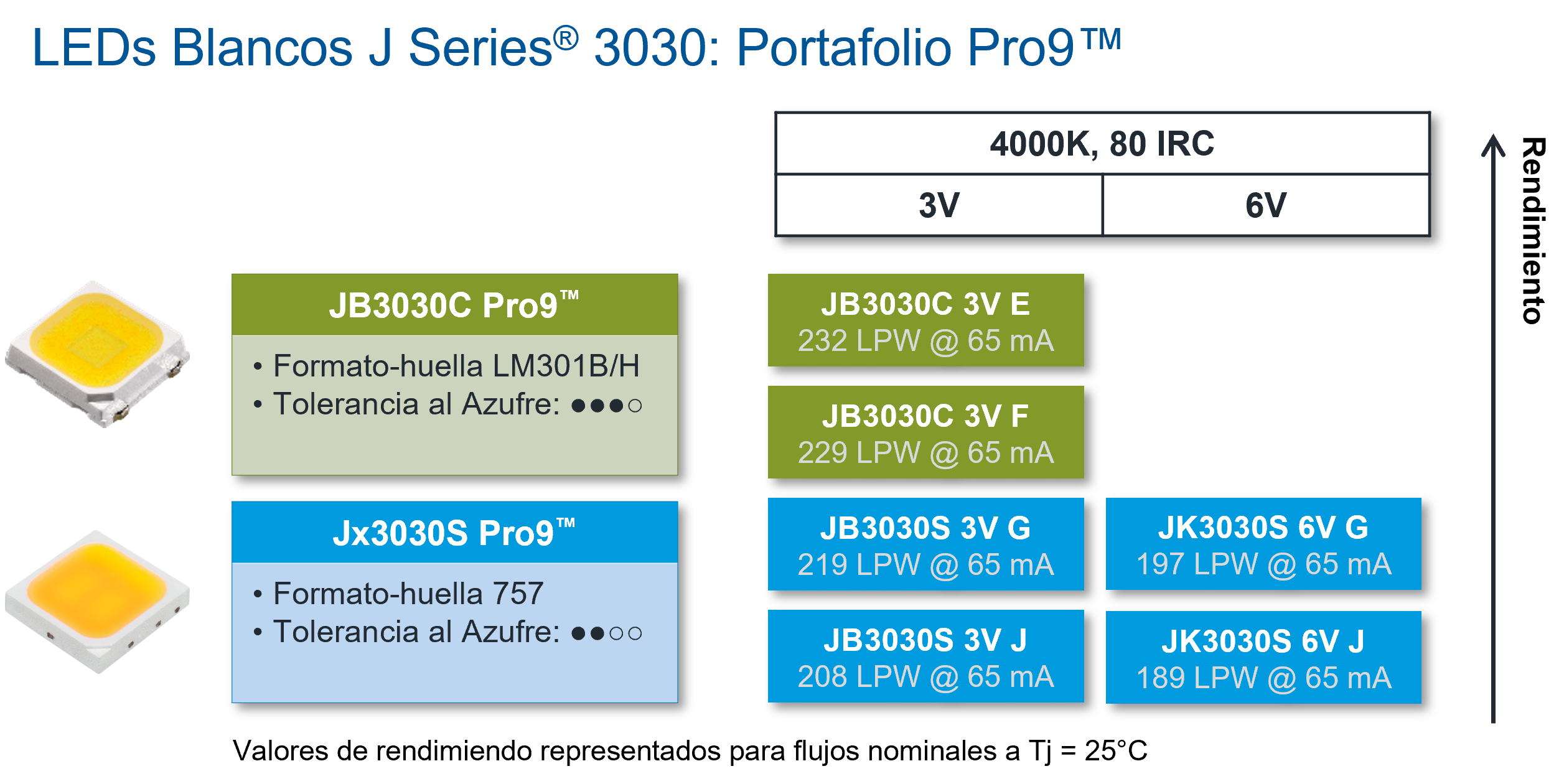 - Pro9 – Mayor eficacia luminosa (LPW) para CCTs cálidos e IRC altos: Hasta un 28% más de LPW que las versiones estándar; el JB3030S 3V G Class ofrece valores nominales de 219 LPW a 4000K, IRC 80 y 207 LPW para 3000K, IRC 90